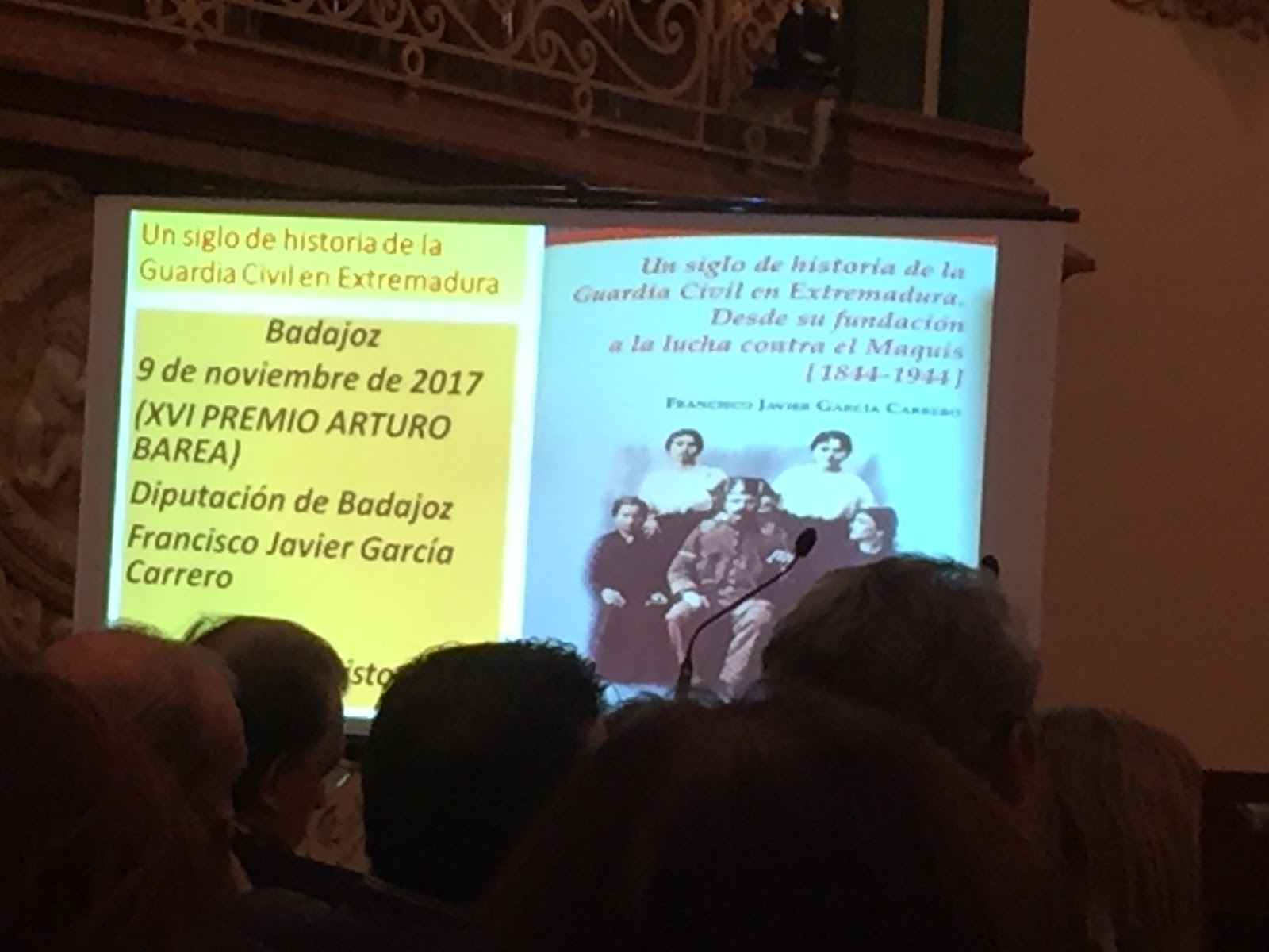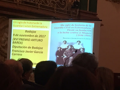 Habrá tiempo de hablar del libro de García Carrero, uno de los investigadores extremeños más rigurosos y comprometidos, ecuánimes, sosegados, de amplia trayectoria y firme apuesta por desvelarnos la trayectoria general de la Guardia Civil en Extremadura (a lo que dedicó su tesis doctoral) y a diversos agentes y autoridades singulares del Cuerpo: su trabajo monográfico sobre el "mando" Manuel Gómez Cantos, recientemente reeditado por la Diputación de Badajoz y la ARMHEX Memoria Histórica Extremadura, es de obligada lectura para entender las desviaciones del abuso de poder. Por lo que nos desveló en la presentación de esta historia General de la Guardia Civil, se profundiza en este tipo de desmanes, pero igualmente en lo que tantas veces significó este Cuerpo, de seguridad en los campos y los pueblos, de auxilio y colaboración con la sociedad. Importante reto para el lector, sin duda alguna, con opiniones y experiencias a veces bastante polarizadas.